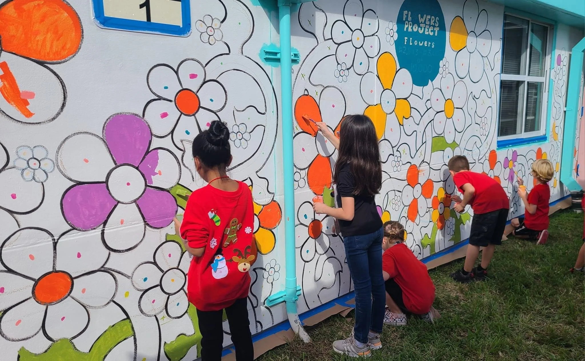 • Cleaning up. After the students (and any teachers/faculty members who wish to participate) have filled in the mural, Tim will spend several days touching up any sections of the wall that are in need of clean-up and outline the design. He will also add the “6 words of worth flower” as well as the Ten Thousand Flowers Project logo and flower count.
