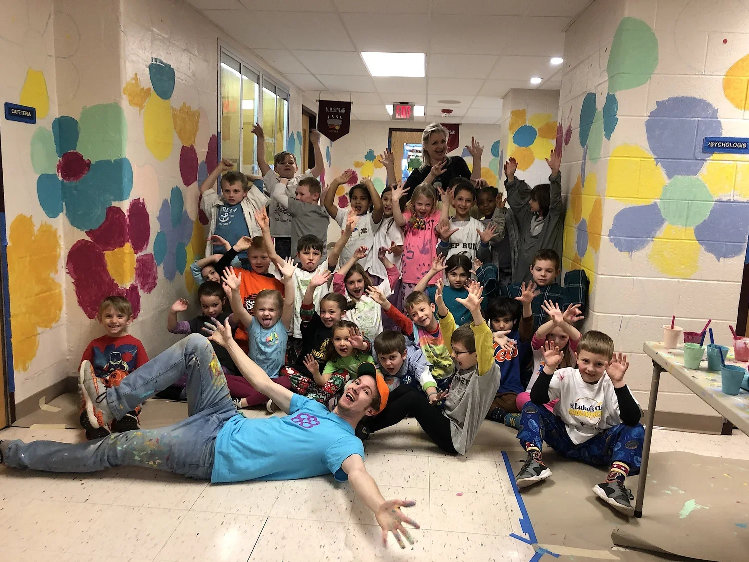 About 5-10 minutes before the end of the workshop, students can return their paint cups and brushes to the work station. We will pose for a class photo in front of the mural and give them several minutes to wash up before returning to class.